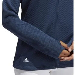 The Adidas Women’s Textured Layer Jacket adds plenty of warmth for chilly tee times. Golfing in this jacket won’t feel any different in its soft stretch, midweight polyester fabric. A full zip jacket with mock neck, the Textured Layer Jacket brings some classic Adidas style and performance to the course with you, while doing their part to save the planet through its recycled construction. The thumbholes on sleeves and curved hem combine for a pleasantly comfortable time wearing.