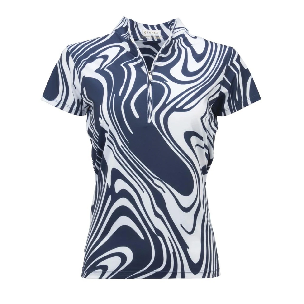 The Women’s Rush Short Sleeve Polo is constructed from a beautifully printed jersey that is soft on the skin, yet cool to the touch. This short-sleeve polo is made using a 90% polyester / 10% spandex blend for the most comfortable, versatile piece of sportswear. The mock collar and zip placket with metallic jewel zipper pull present an attractive, sleek look for the female golfer. Using Delux Dri™ moisture wicking technology, the lightweight jersey fabric will keep you cool and dry from the first tee to the final green. With the signature Lopez flame icon at the right hip, this polo boldly highlights the golfer as she conquers the eighteen holes.