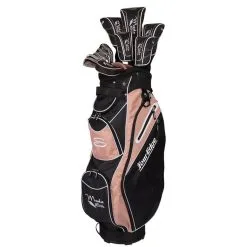 The same company that gives you high-end materials and performance in their Exotics line, Tour Edge, now offers you the same time and commitment to a package set with the Moda Silk. The perfect beginner’s set for women, the Moda Silk gives you everything you need to start and enjoy the game, without the guesswork. Along with the matching premium cart bag and covers, their are 11 clubs in all. The driver is oversize at 460cc and has 15° of loft to increase launch and deliver higher, longer drives. The 3 and 5 woods are offset with a low-profile design. The low center of gravity helps get the ball in the air from any lie. 5 and 6 hybrids replace tough to hit long irons and provide plenty of forgiveness. The 7 iron thru sand wedge are oversized with a perimter-weighted undercut cavity for ultimate forgiveness. A high MOI mallet-style putter is easier to line up and aids in accuracy.